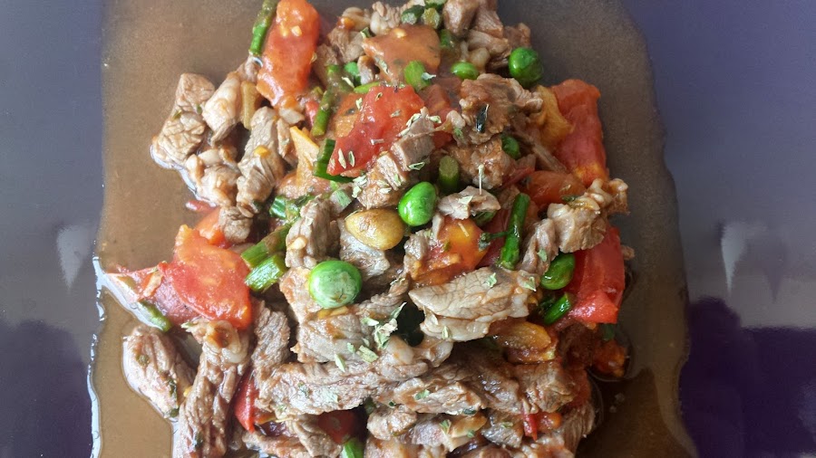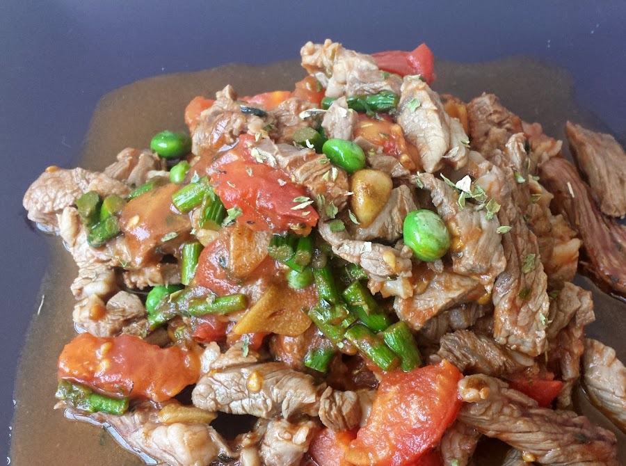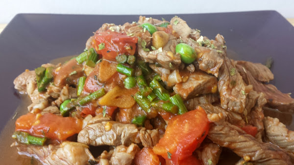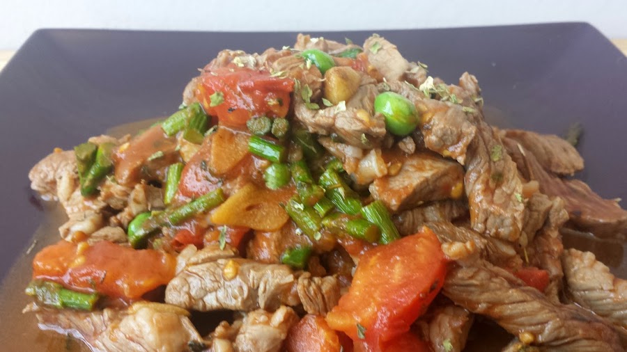 Añadimos aceite de oliva al wok y salteamos en primer lugar la carne para que no se cueza. Cuando la carne este dorada iremos añadiendo las verduras en primer lugar los ajos, despues los tomates y los trigueros y por ultimo los guisantes, salteamos bien todo el conjunto.
