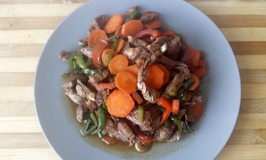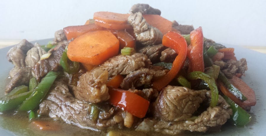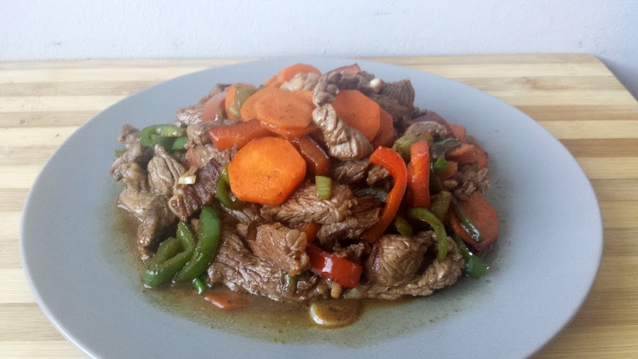 Salteamos la carne como en la receta anterior, despues incorporamos las verduras siguiendo este orden: Los ajos, la cebolla, los pimientos y la zanahoria, salteamos bien todo el conjunto y sazonamos con la salsa de soja y perfumamos con un poco de aceite de sesamo.