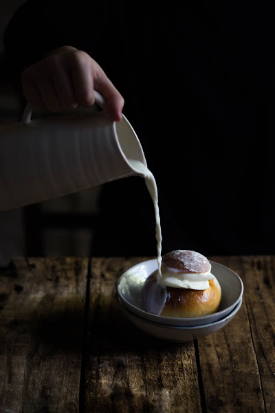 Estos Semlor pueden tomarse así tal cual, pero en Suecia suelen tomarse en un cuenco servidos con leche caliente. El bollo se empapa de la leche y el resultado es una auténtica delicia.