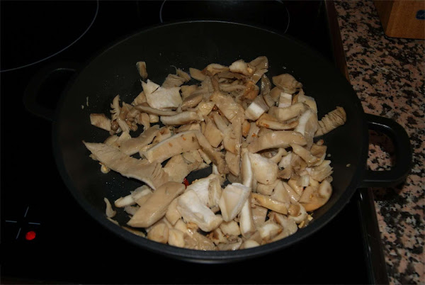 Incorporamos las setas y añadimos un poco de sal. Salteamos con cuidado de que no se rompan y dejamos que se hagan un poco.