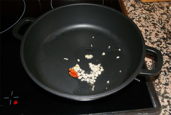 Sal Pelamos el diente de ajo y lo cortamos pequeño. En una sartén ponemos un poco de aceite a calentar y doramos la guindilla con el ajo, removiendo para evitar que se queme mientras cortamos las setas en trozos. Si quieres que estén un poco más picantes, añade una guindilla más.