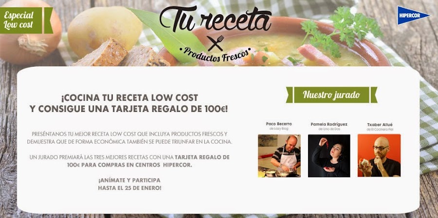 En esta ocasión, la temática es bien sencilla, se trata de hacer una receta económica o Low Cost, elaborada con productos frescos. Algo con patatas, cebollas, verduras, carnes, pescados, lo que os apetezca pero que resulte económico. El premio, 100 euros para comprar en Hipercor, y todo en los próximos 15 días. Espero que como en otras ocasiones os animéis a participar con vuestras ideas porque además va a haber Tres ganadores cada uno de ellos con su tarjeta de regalo.