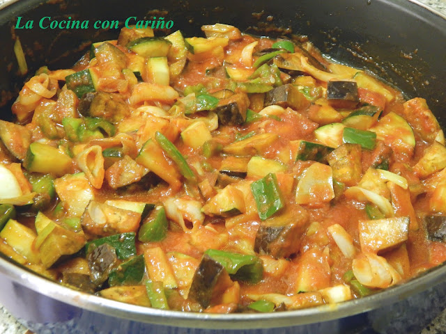 Pasado este tiempo, añadimos los pimientos y rehogamos un par de minutos más, luego el calabacín y un par de minutos después la berenjena. Salpimentamos y ponemos al mínimo el fuego, tapamos y movemos de vez en cuando. Lo tendremos así unos 5 minutos.