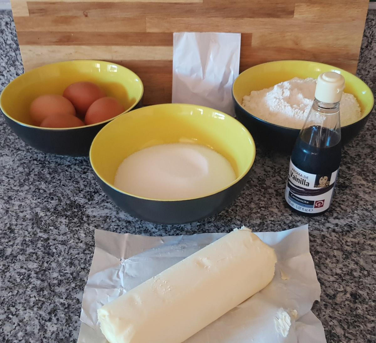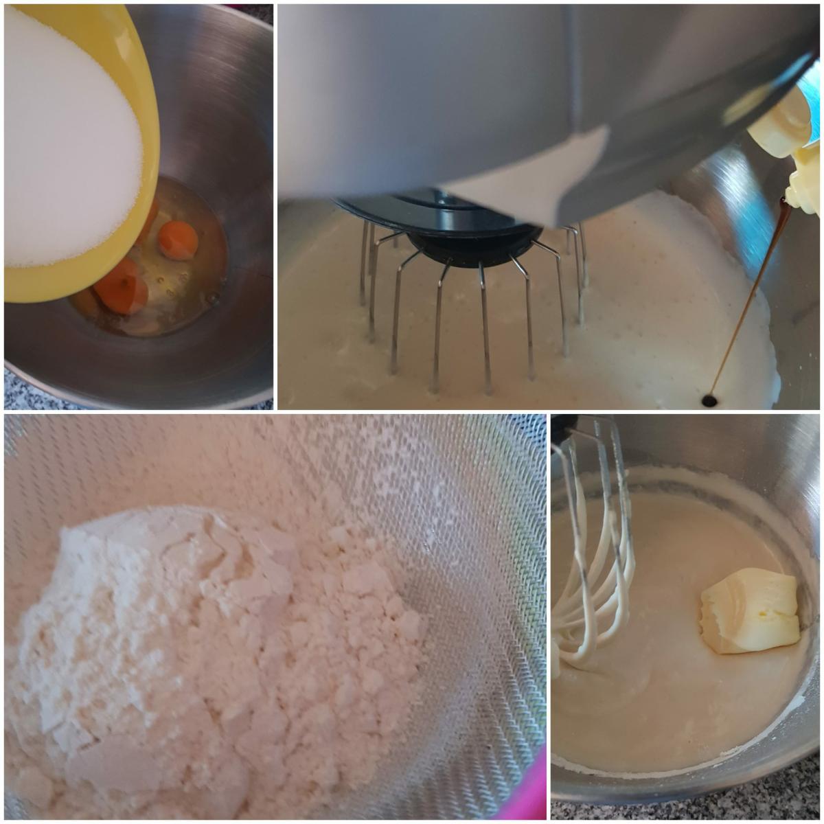 El bizcocho: Precalentamos el horno a 160ºC, con una varillas eléctricas, batimos los huevos y el azúcar, hasta que doblen su volumen. Una vez doblen su volumen, le bajamos la potencia a las varillas y le agregamos la esencia de vainilla, y le vamos añadiendo poco a poco la harina, la levadura y la pizca de sal, que abremos tamizado. Una vez mezclado todo bien, introducimos la mantequilla y seguimos mezclando hasta que se integre bien.