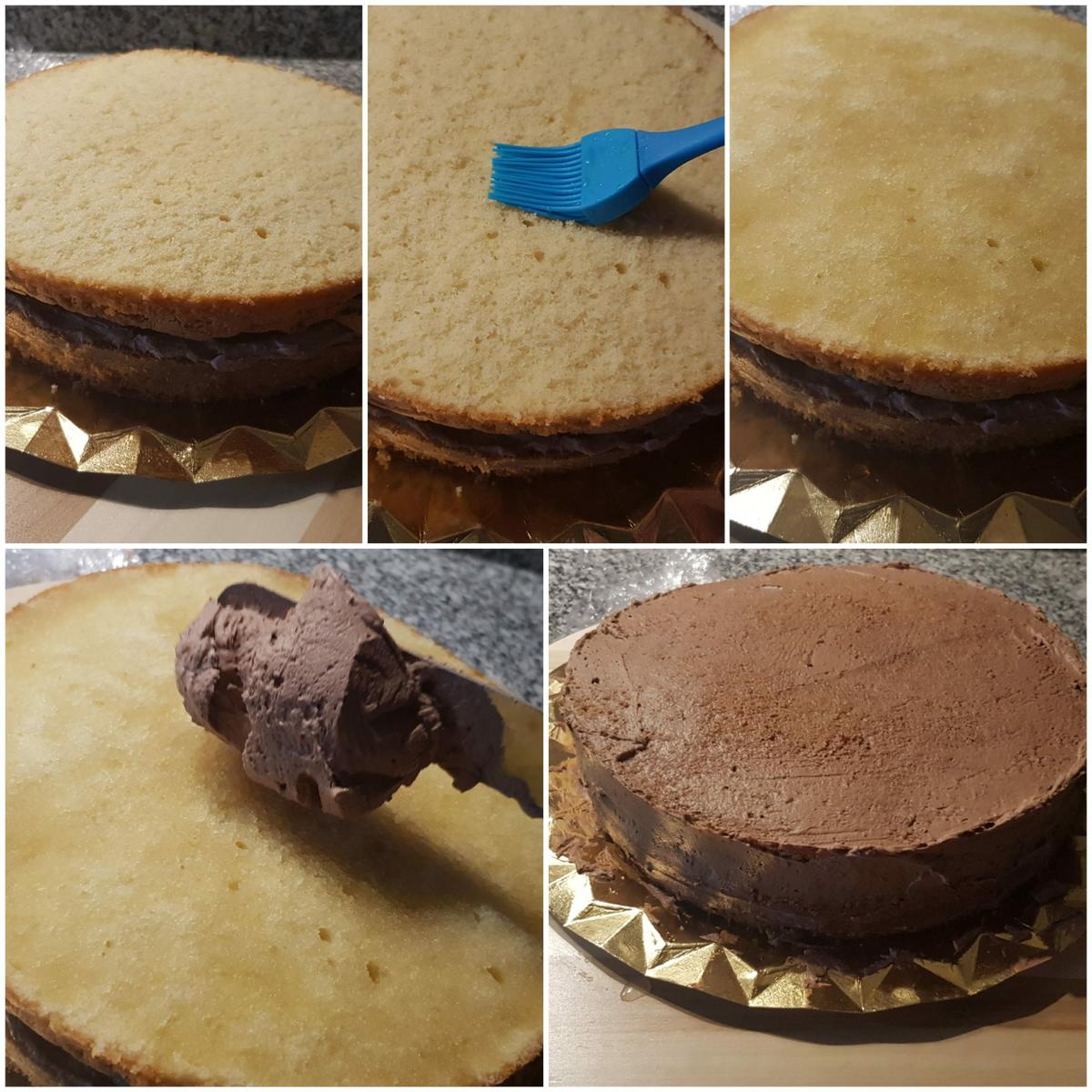 Rellenar: Ponemos la parte de abajo del bizcocho, sobre una base o plato, y con ayuda de un biberón o un pincel vamos incorporando el almíbar, asegurándonos que lo añadimos bien por todos los bordes y lo dejamos bien húmedo, y le añadimos una capa de ganache al gusto.