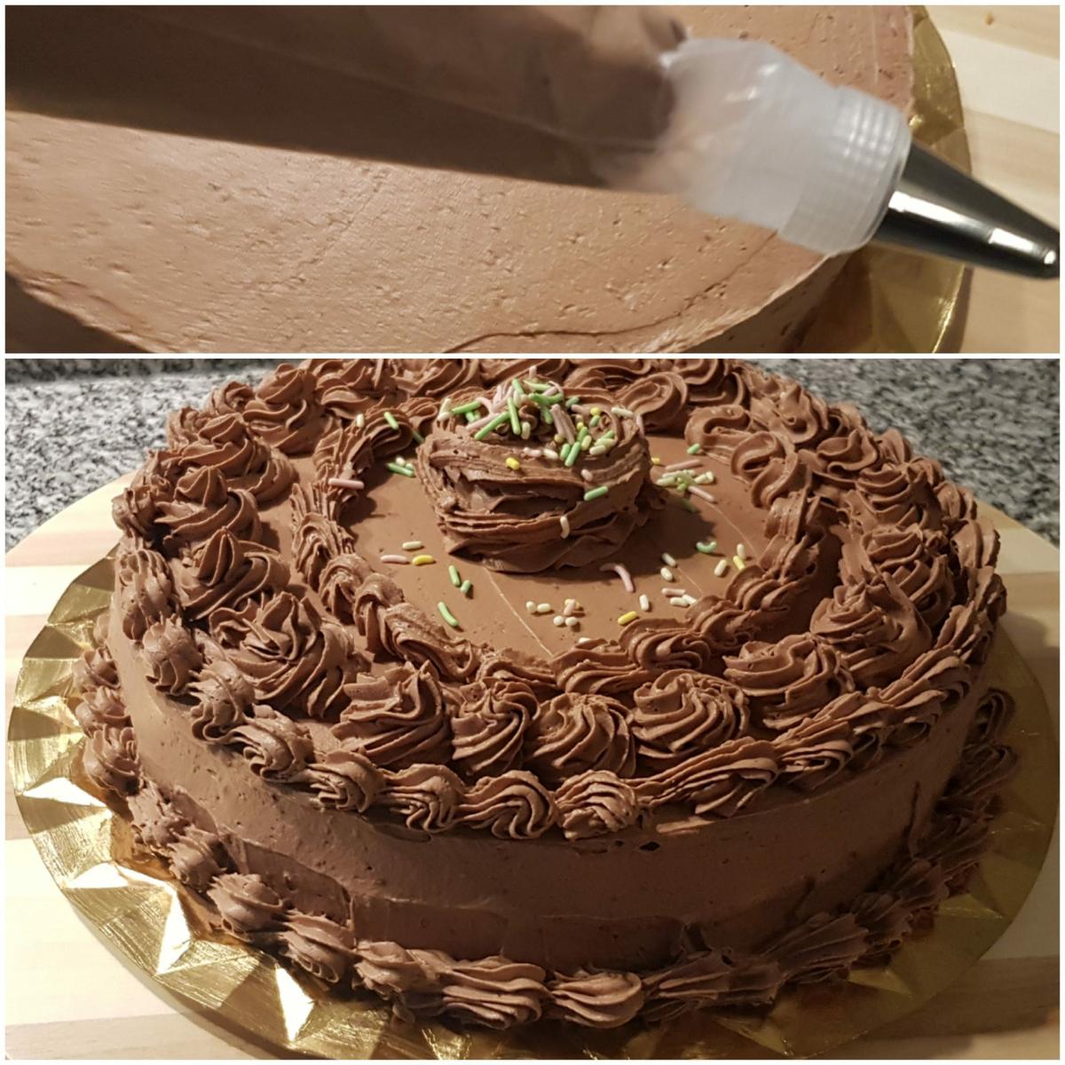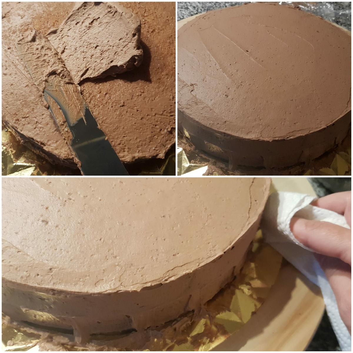 Decorar: Pasado el tiempo de reposo, ponemos una buena capa de ganche y cubrimos toda la tarta, lo alisamos bien, para que quede todo parejo, una vez estemos contentos con alisado, limpiamos bien los bordes de la base o plato, que se habrá manchado.