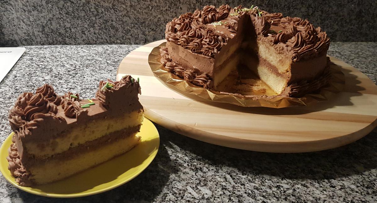 La verdad es que estoy muy contenta, porque bueno, quería hacer un bizcocho bastante consistente para poder humedecerlo y que aguantara, así que hice un bizcocho con sabor a vainilla, que estaba muy rico, lo rellené con la ganache y luego lo cubrí también con la misma ganache de chocolate.