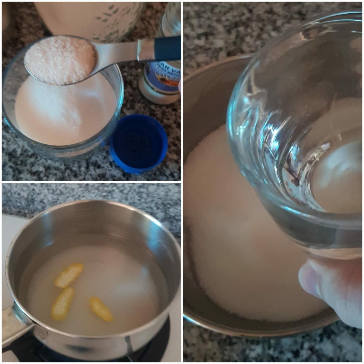 El almíbar: Mezclamos los ingredientes en un cazo y ponemos a calentar a fuego medio, cuando empiece a hervir, dejamos cocer unos 4 minutos, pasado el tiempo, retiramos del fuego y dejamos enfriar. Reservamos.