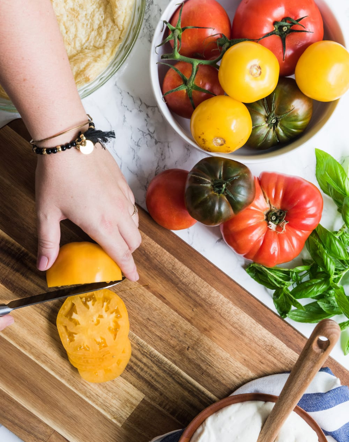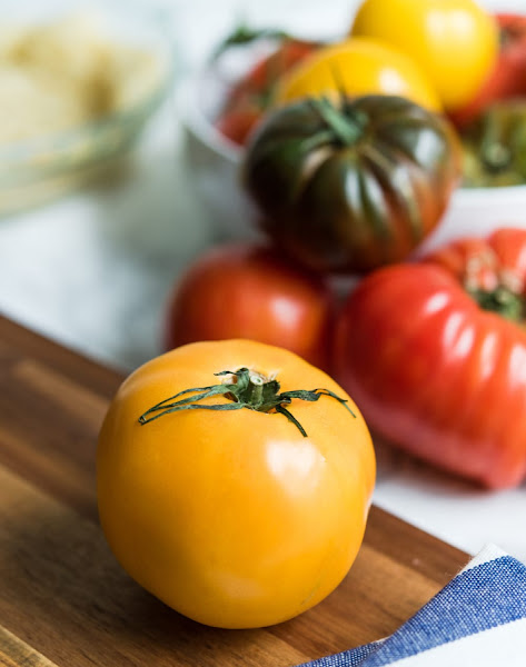 Cortamos en rodajas finas los tomates. Puedes ser de la misma clase o de diferentes tipos; Rosa, amarillo, rojo, azul..........................