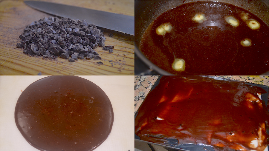 Vertemos el agua y la glucosa en un cazo y mezclamos ligeramente con una espátula de silicona. Agregamos la mantequilla, el cacao en polvo y el azúcar mezclado previamente con la pectina (al proceso de mezclar estos dos ingredientes se le llama encapsular; es importante para evitar que se formen grumos al calentar la mezcla).