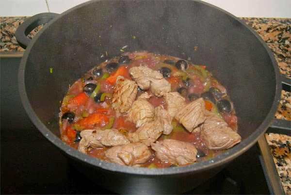 Volvemos a añadir la carne de ternera y dejamos que se cocine bien otros diez minutos a fuego medio, hasta que la carne esté tierna y los sabores se mezclen bien. Si vemos que queda mucho caldo, dejamos un poco más para que se reduzca todo.