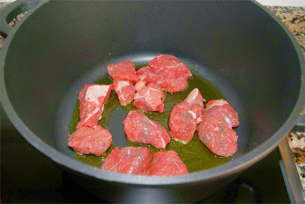 Sal Salpimentamos la carne de ternera. Ponemos a calentar el aceite en una cacerola, cuando esté bien caliente doramos la carne, procurando que esté bien sellada por todos los lados. Sacamos de la cacerola y reservamos.