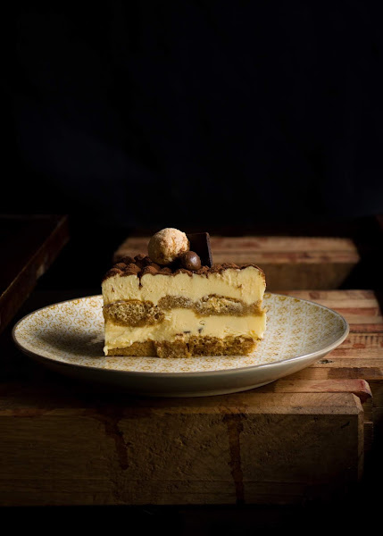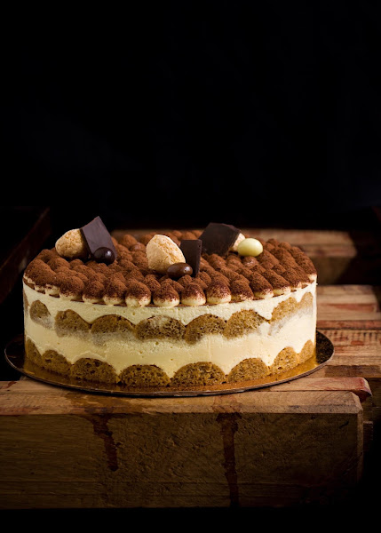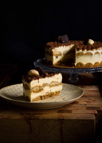 La tarta, tal y como se ve en la foto, se compone de: bizcochos soletillas empapados en almíbar de café y ron, crema de mascarpone con trocitos de chocolate y cacao en polvo como cobertura.