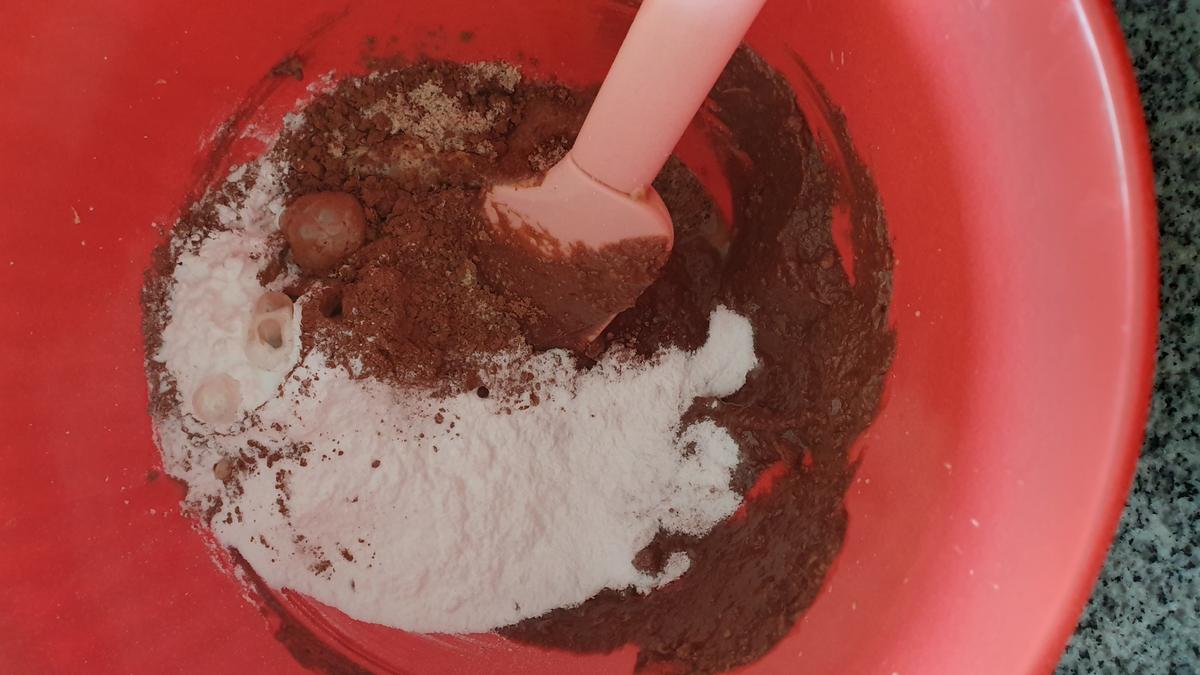 Agregar la harina de almendras, polvos, vinagre, cacao en polvo, endulzante y la vainilla. Mezclar bien hasta lograr una masa homogénea.