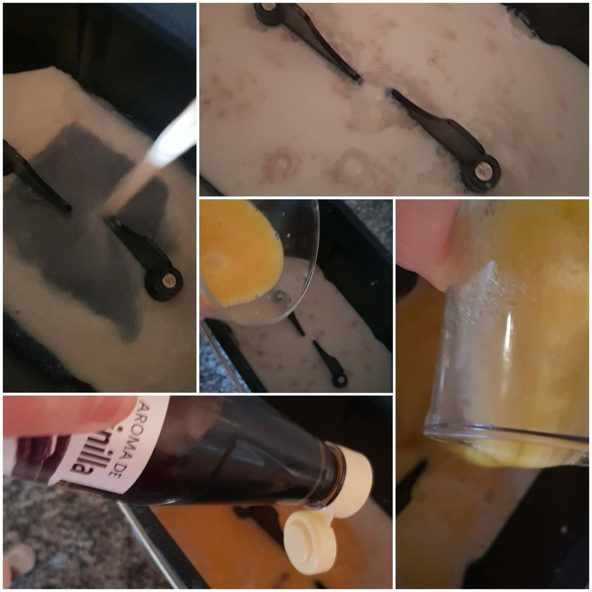 Tiempo necesario: 3 horas.Introducimos los líquidos en la cubeta Primero introducimos todos los líquidos en la cubeta, que tendrá que llevar las aspas en su posición. Metemos la mantequilla derretida, la leche calentada unos segundos en el microondas, la levadura, los huevos ligeramente batidos (reservamos un poco para luego pincelar) y la esencia de vainilla.