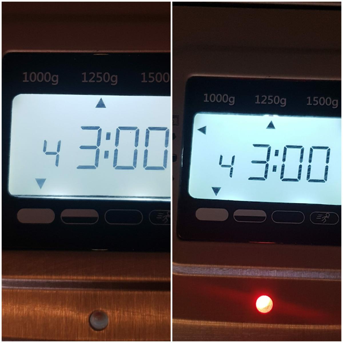 Seleccionar programa Seleccionamos el programa 4, dulce, el peso 1.250kg y el tueste, yo puse tueste bajo, pero esto va a gustos, le damos a iniciar y nos aseguramos de que se enciende la lucecita roja.