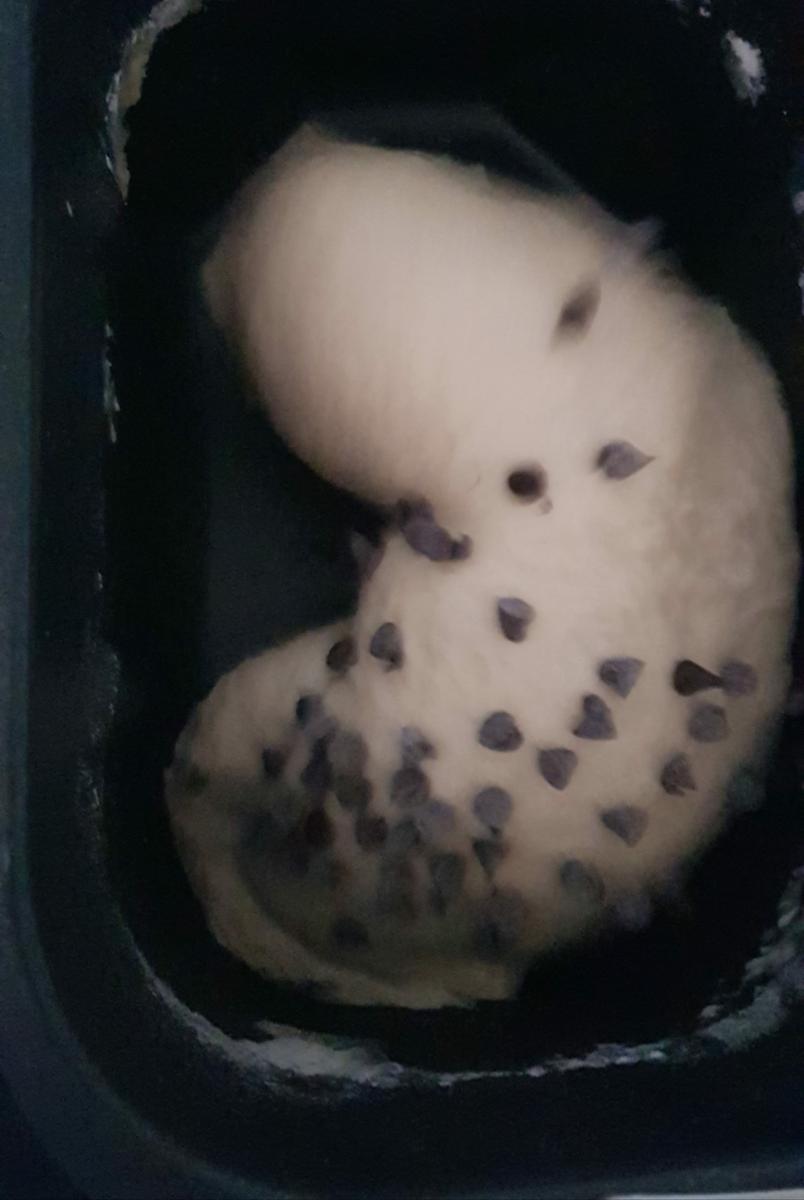 Segundo pitido En el segundo pitido, quitamos las aspas, acomodamos la masa, pincelamos la masa con el huevo batido, echamos las pepitas de chocolate que nos quedan y cerramos la tapa. No abráis para nada la tapa mientras fermenta la masa, cuando termine de fermentar quedará así.