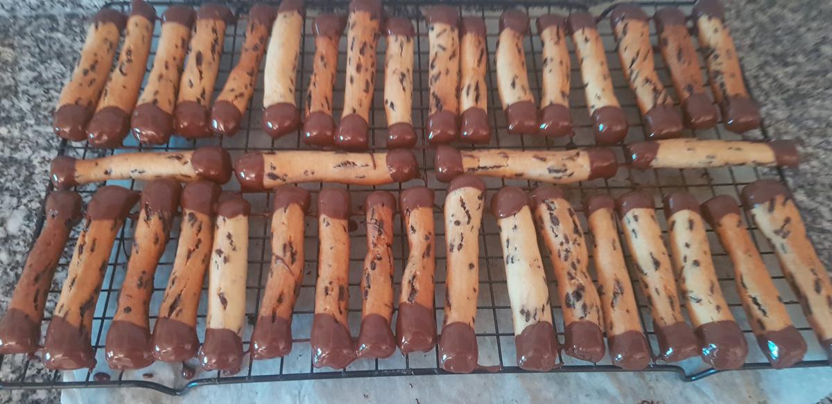 Dejar secar Cuando hayáis bañado las dos puntas dejáis secar. El problema en mi caso es que ya hace calor en mi casa y no tengo aire acondicionado así que les costó un poquito más endurecer el chocolate… y por supuesto cayeron media docena con el chocolate derretido