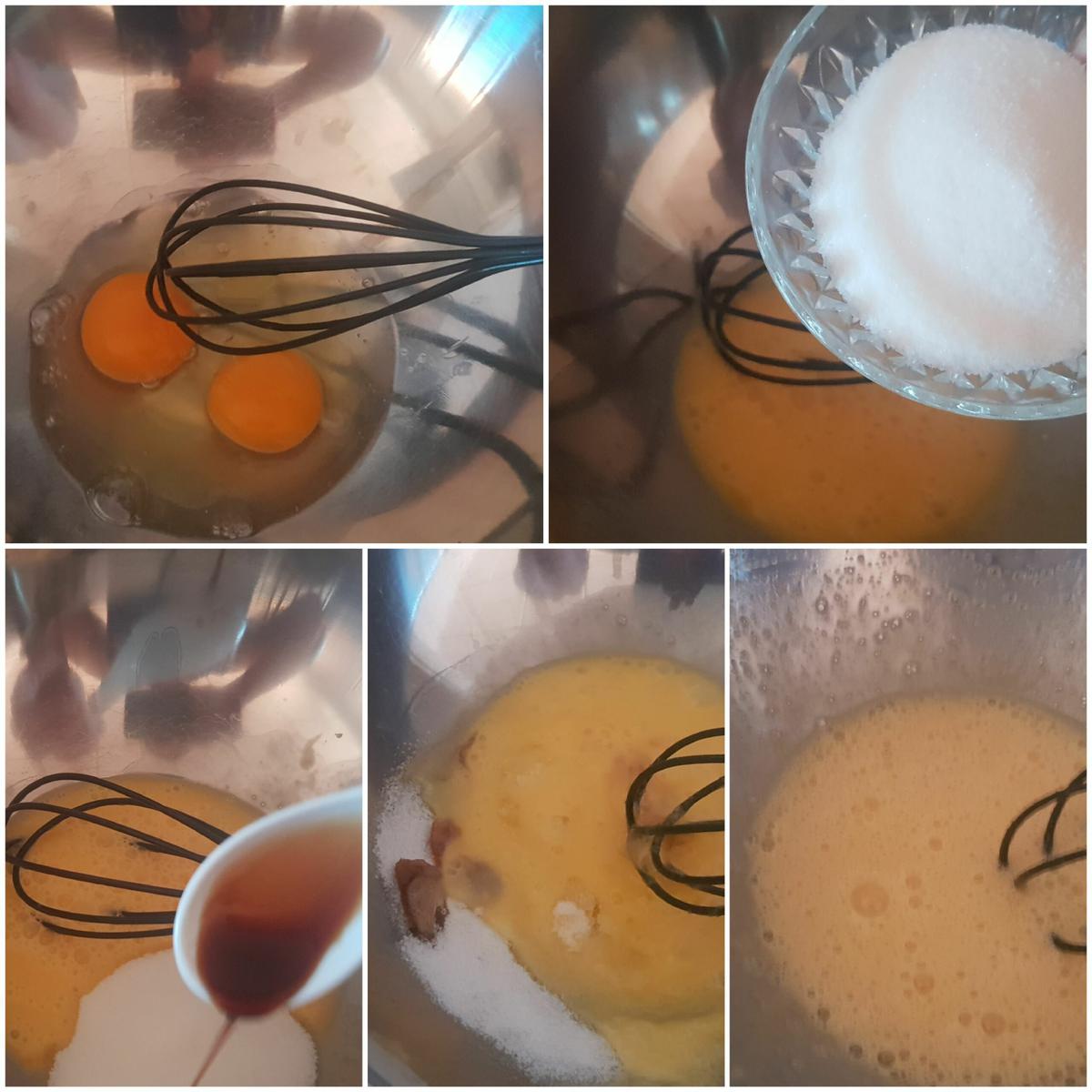 Tiempo necesario: 1 hora.Batir los huevos En un bol ponemos los huevos y los batimos, luego añadimos el azúcar y la esencia de vainilla, lo batimos todo bien hasta que ya no notemos los granos de azúcar.