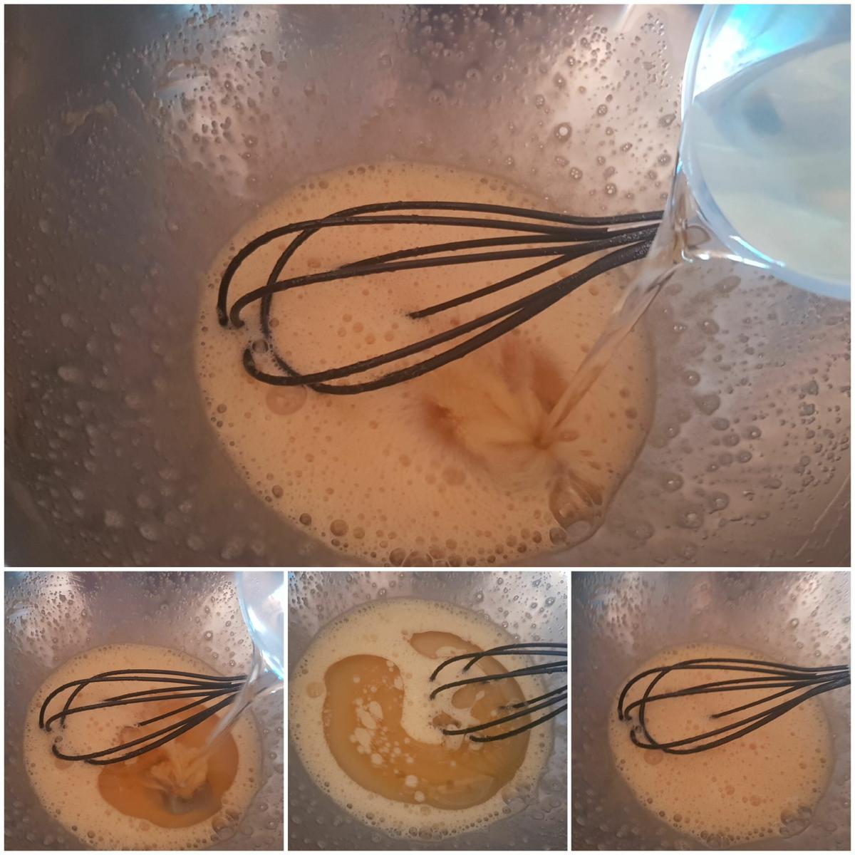Añadir el aceite Cuando tengamos bien mezclados los huevos con los demás ingredientes, añadimos el aceite. Removemos muy bien, nos ayudamos con unas varillas, la mezcla tiene que quedar homogénea sin burbujas de aceite. Tiene que quedar bien incorporado a la mezcla, para que a la hora de hornear no nos salgan burbujitas de aceite por el calor.