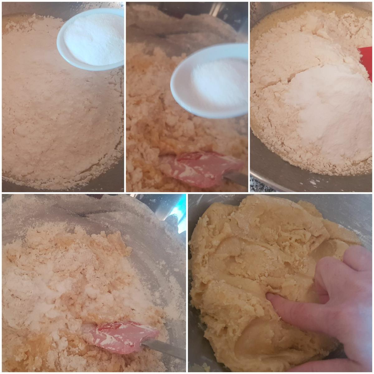 Añadir los ingredientes secos Añadimos 330 gr de harina, la levadura y la sal, y mezclamos bien con la espátula, si vemos que nos cuesta terminamos de mezclar bien los ingredientes con las manos bien limpias. Tiene que quedar una masa blandita, pero manejable y que no se pegue en las manos, si no es así añadirle los 20 gramitos que hemos dejado de reserva. A mí la primera vez que hice las galletas necesité los 350 gr de harina, pero en la segunda solo 330 gr, por eso os he puesto los dos gramajes.