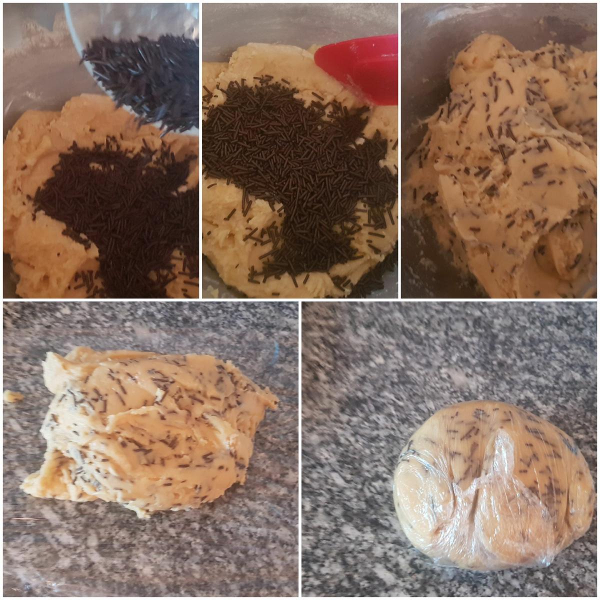 Añadir los fideos de chocolate Cuando tengamos el punto de la masa, es hora de sacar los fideos de chocolate de la nevera e incorporarlos a la masa y mezclarlo bien con una espátula. Si no lo hacéis con la mano mejos, ya que con el calor de ella se desharía los fideos de chocolate. Una vez bien incorporados los fideos, hacemos una bola con las manos y envolvemos con papel film. Dejamos reposar la masa en la nevera 15-20 minutos, para que se enfríe un poco y que sea más manejable.