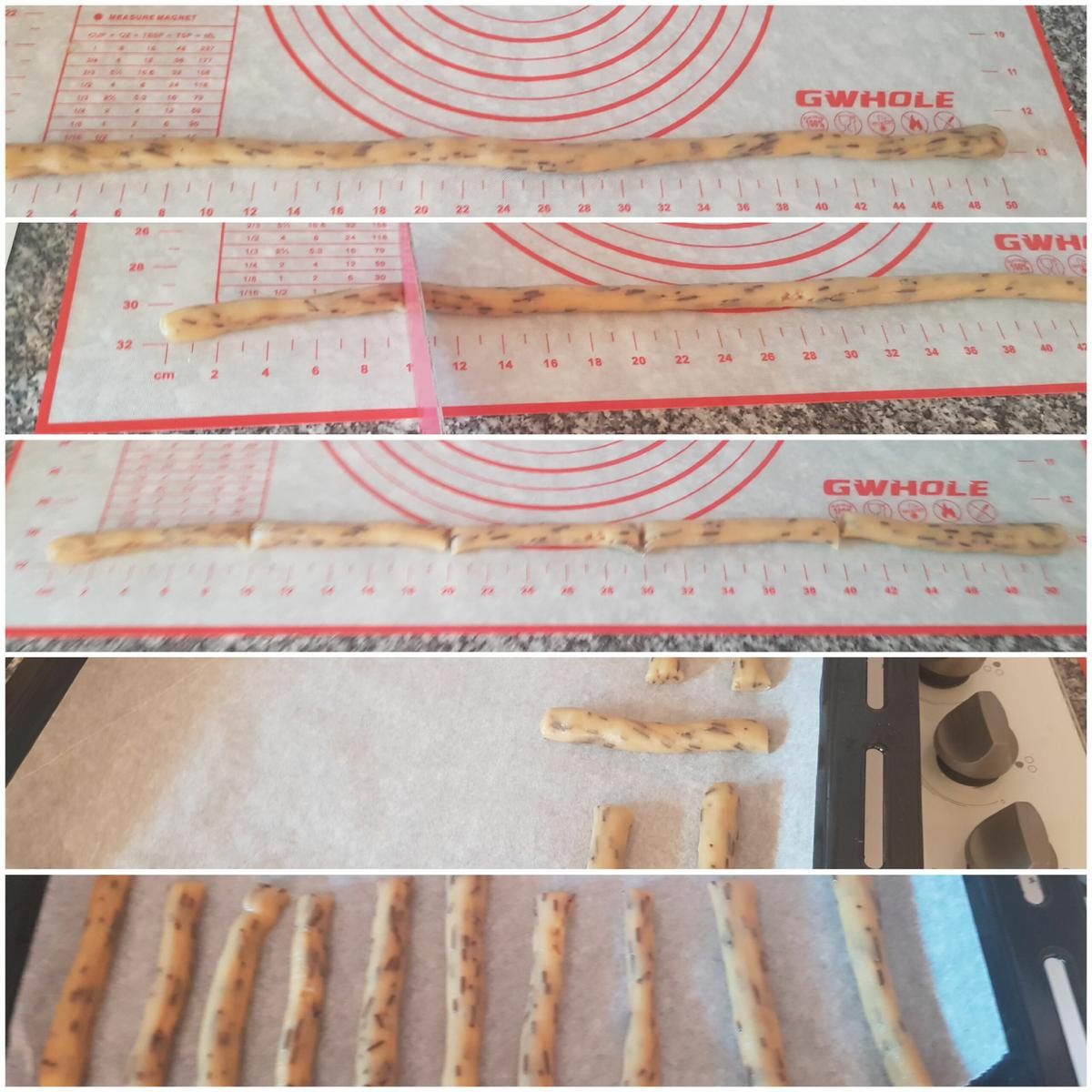 Preparar las rosquilletas Cogemos una porción de las que hemos cortado y empezamos a estirarla con cuidado que o se rompa, hasta que mida más o menos unos 50 cm. Luego cortamos con un cuchillo tiras de unos 10 cm, por lo tanto nos saldrán unas 5 rosquilletas de cada porción. Vamos colocándolas sobre la bandeja con papel de horno.