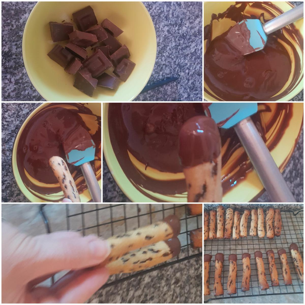 Bañar con chocolate Cuando tengamos las galletitas frías, derretimos el chocolate, o a baño maría, o en intervalos de 20 segundos en el microondas. Yo lo hago al microondas en modo descongelación, así la temperatura es más baja y evito que se me queme. Cuando tengamos el chocolate derretido cogemos una a una las rosquilletas y bañamos una punta, retiramos el exceso de chocolate y dejamos reposar hasta que solidifique. Yo lo que hago es hacer una de las puntas de todas las rosquilletas y cuando secan, hago la otra punta. Así evito que si hago las dos a la vez, chorree el chocolate.