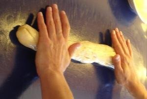 Con las manos embadurnadas de manteca vamos enrollando la masa dándole forma alargada. Es una masa muy pegajosa pero es importante que sea así.