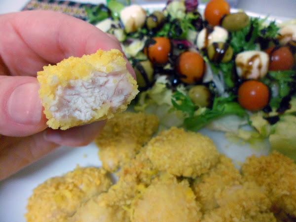 Hoy la receta son unos fantásticos bocaditos de pollo rebozados al horno, que no son nuggets porque el pollo no está procesado, sólo que lo he cortado de tamaño bocado.