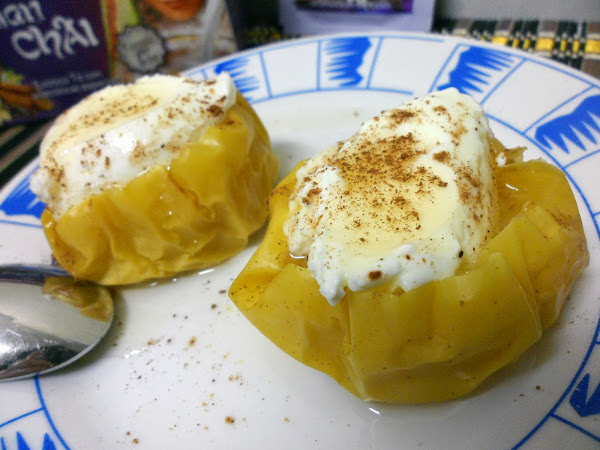 -Colocar las mitades de manzana en un plato, colocar crema de queso por encima, endulzante líquido y canela.