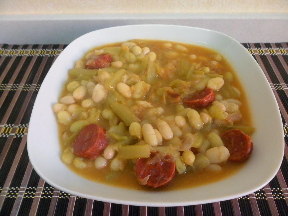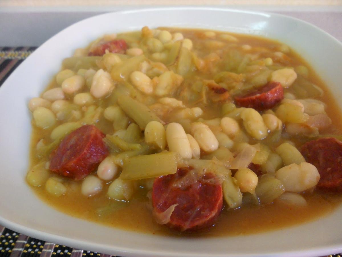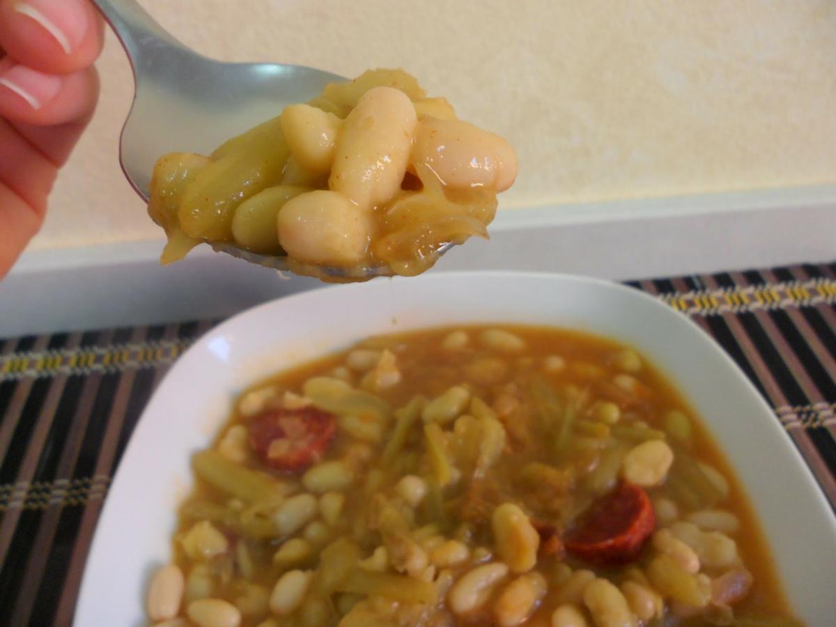 -Una vez evaporado el alcohol y cocinado el chorizo, añadir el chorizo escurrido en la cazuela y el contenido del bote de pochas con borraja (no hace falta escurrir).