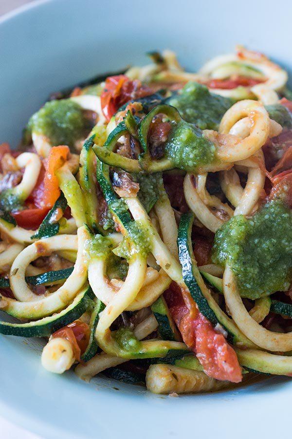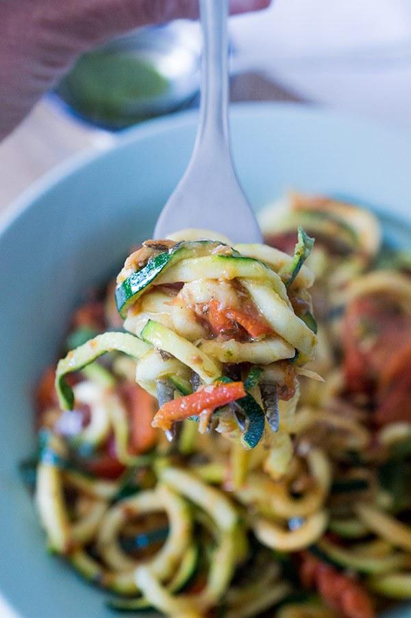 Los zoodels son los tallarines de calabacín y he de confesaros que me he hecho adicta a ellos! Que faciles son de preparar, y de verdad que creo que me gustan mas que la pasta normal. Ultimamente no tengo mucho tiempo, llega el fin de semana y todos mis planes de cocinar se van al traste porque seamos sinceros últimamente me apetece disfrutar de los días enteros y me entrego a las comidas con amigos, el vermuteo y esas cosas… luego entre semana con el trabajo y demás historias no tengo tiempo de cocinar y hacer fotos, así que a veces me pilla el toro e improviso… La verdad es que estas improvisaciones me suelen salir muy bien, así que genial, una comida en 10 minutos y un post para el blog! Hace tiempo publique la pasta marta! Una pasta deliciosa hecha con tomates cherry, sardinas y albahaca! Pensé… esto seguro que queda genial con los tallarines de calabacín o también llamados zoodels! Y que os puedo decir! Pues que estaba buenísimo! Que ademas se hace super rápido, que es una comida sana perfecta para una persona, y que creo que se va a convertir en un recurso semanal!