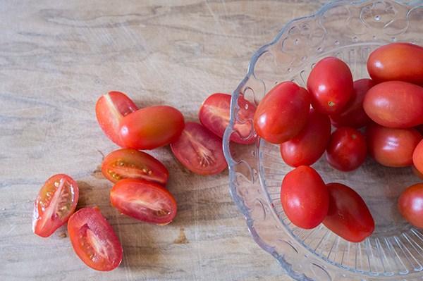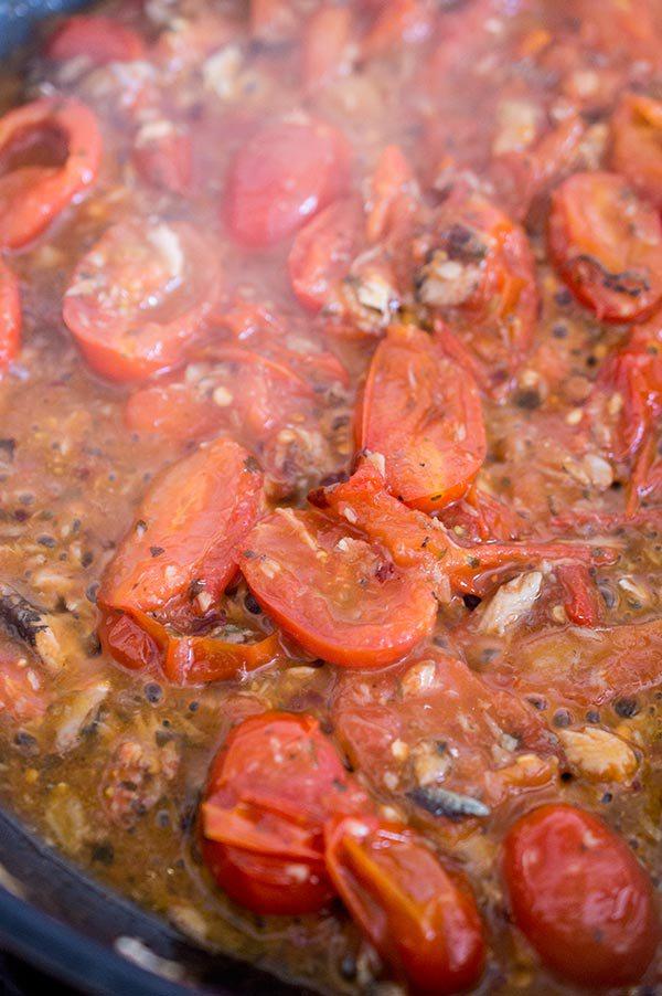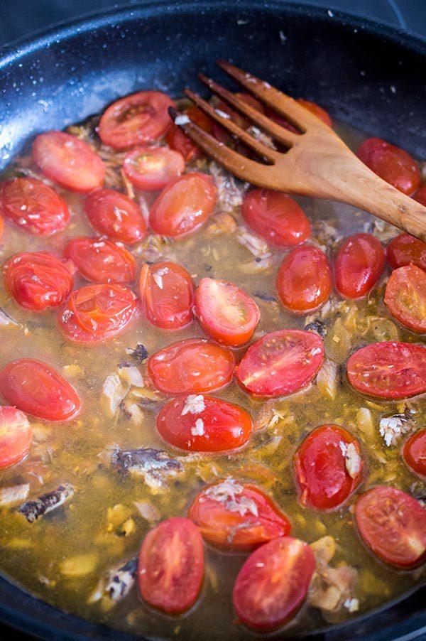 A continuación añadimos los tomates partidos por la mitad y un chorrito de agua, así evitamos que el ajo se queme y se empiece a formar la salsa.