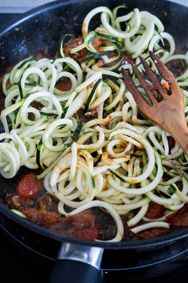 Cuando la salsa esta muy reducida, añadimos los zoodels y cocinamos 2 minutos mas!