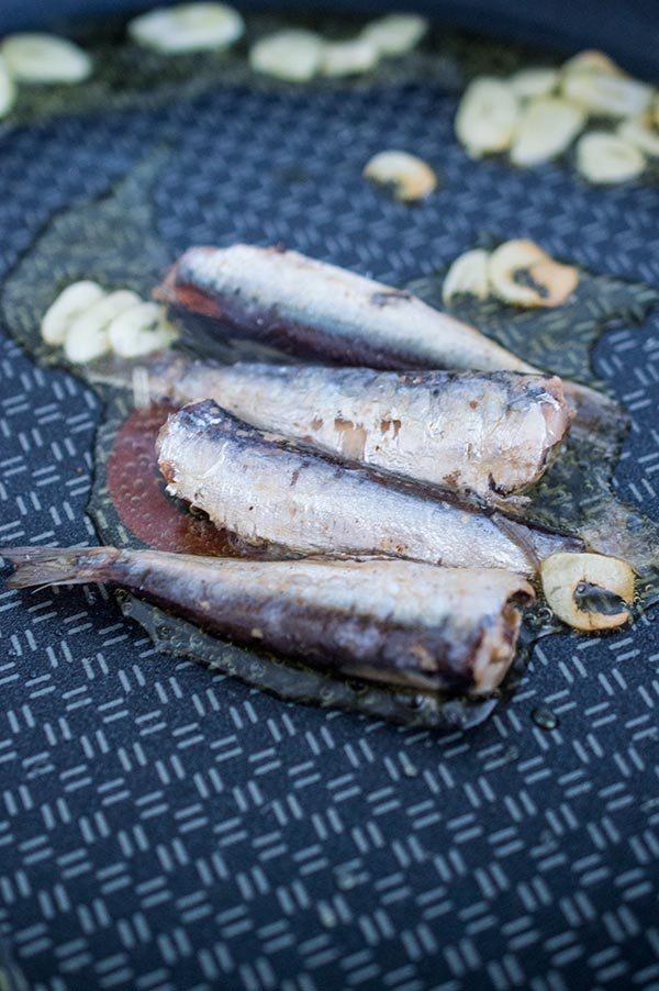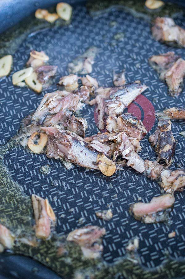 Cuando este dorado añadimos las 4 sardinillas y las chafamos con la ayuda de una cuchara de madera.