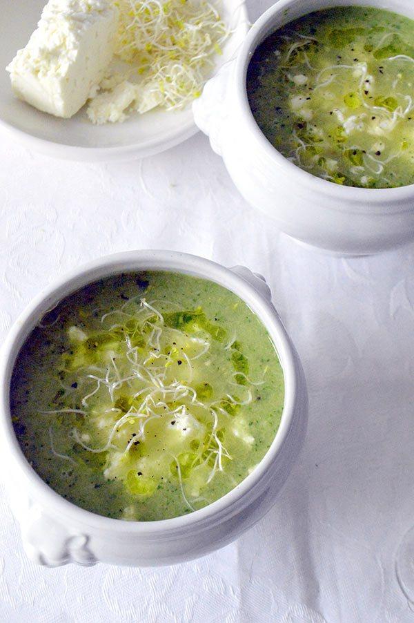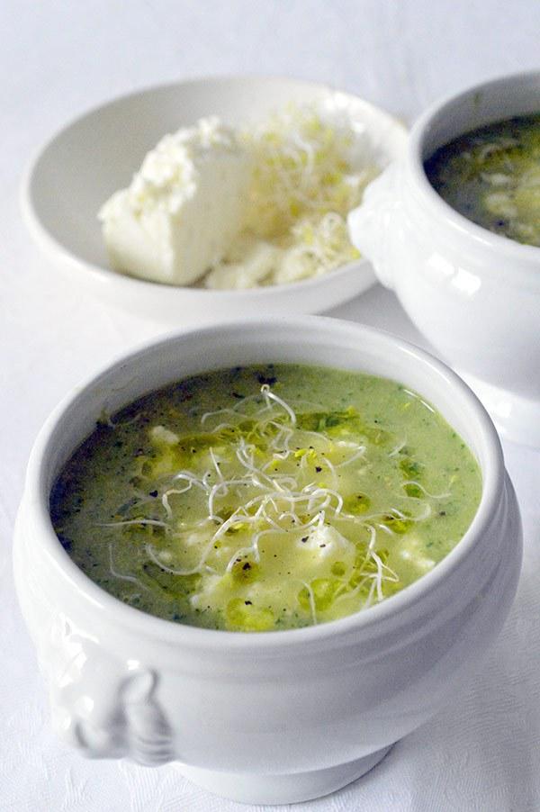 Ya sabeis que me encanta el brócoli es sin duda una de mis verduras fetiche, nunca la había tomado en sopa y encontré esta receta en la pagina web de Jamie Oliver, yo la he variado simplemente sustituyendo el queso ricotta por un queso feta que me parece mas sonroso y mas fácil de encontrar en cualquier supermercado. La menta da el toque especial a esta sopa, y es un ingrediente que los ingleses usan mucho con las verduras y a mi me gusta mucho! también he añadido unos brotes de alfalfa que tenia en la nevera y dan un poco de textura a la sopa! por supuesto vosotros podéis añadir lo que queráis como unos picatostes de un buen pan fritos!