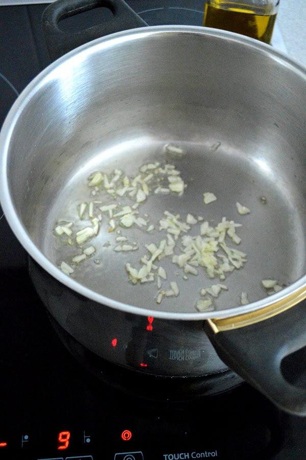 Ponemos un chorrito de aceite de oliva virgen extra y doramos los ajos.