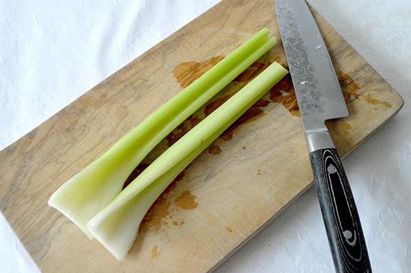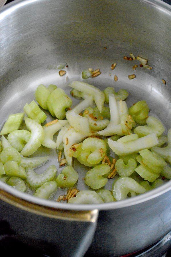 Lavamos y picamos las ramas de apio y las añadimos al sofrito. sofreímos unos minutos.
