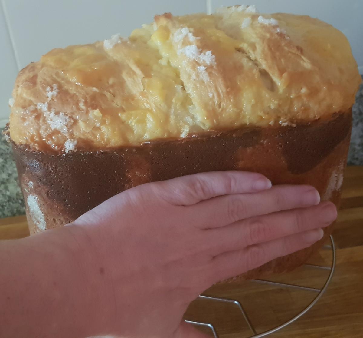 Al Horno! Pasados los 20 minutos, toca meterlo en el horno o hornearlo en la panificadora… Si es al horno, hornear a 180ºC, con calor arriba y abajo durante unos 15-20 minutos, si veis que por arriba ya está cocido pero aún le queda un poco por hacer por bajo, tapar la superficie con papel de plata para que no se os pase cocción. Para los que lo hagáis en la panificadora, yo lo puse en el programa horneado 15, tueste medio, durante una hora.