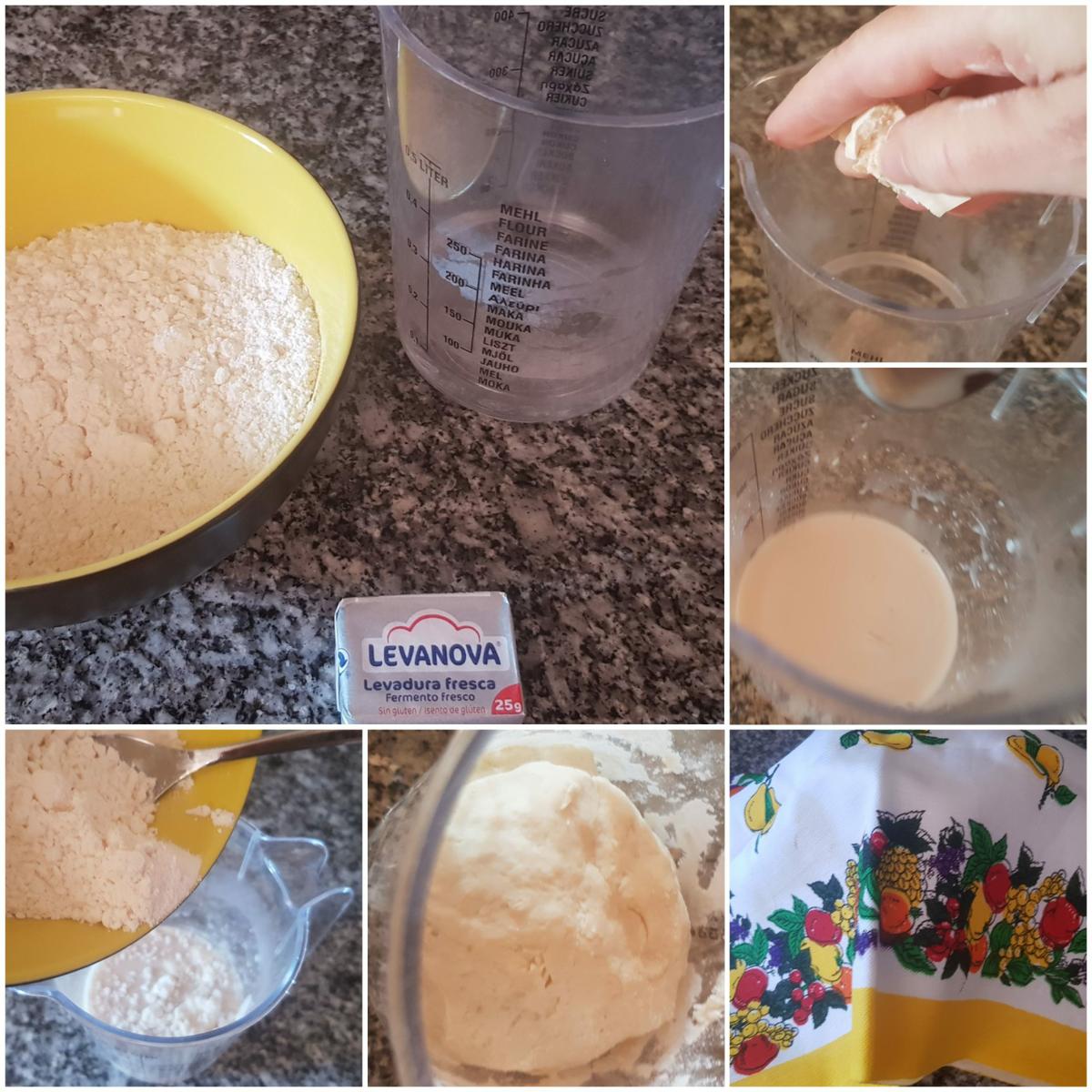Fermento Empezaremos haciendo el fermento, en una jarra incorporamos el agua tibia, con la levadura y lo mezclamos hasta disolver la levadura, después le añadimos la harina y amasamos hasta tener una bola de masa bastante espesa, tapamos con papel film o un paño y lo dejamos levar en un sitio cálido 1 hora o hasta que doble su volumen.