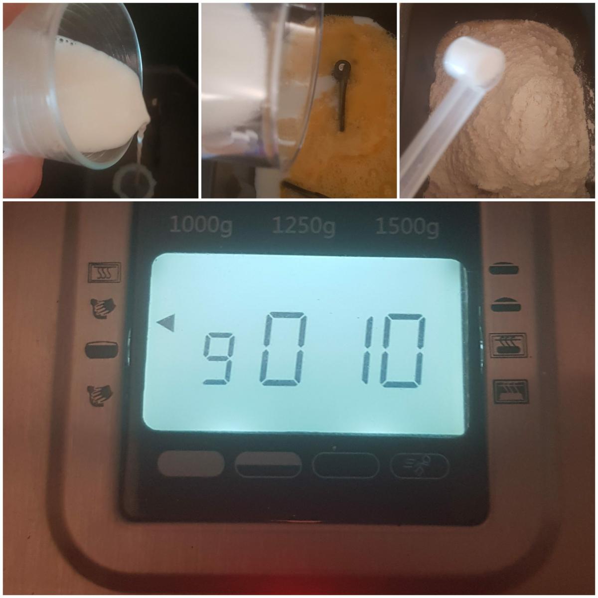 Preparar la masa, primer amasado En la cubeta de la panificadora, o en un bol si la vamos a amasar a mano o con la amasadora, añadimos la leche, los huevos ligeramente batidos, el azúcar, la esencia de azahar, la harina y la sal. Batimos hasta que queden ligados todos los ingredientes o en mi casa lo pongo a amasar 10 minutos en el programa 9 en la panificadora.