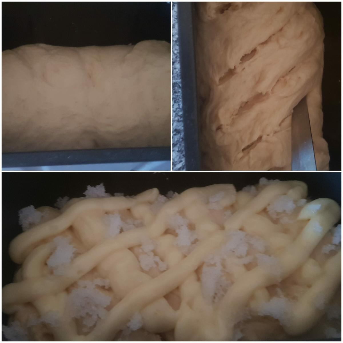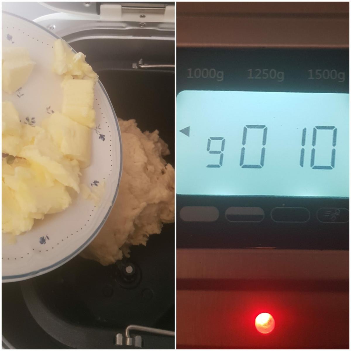 Tercer amasado Pasado el tiempo del segundo amasado, añadimos la mantequilla, que tiene que estar blandita a temperatura ambiente, y amasamos hasta que se incorpore perfectamente a la masa, yo en mi caso vuelvo a poner el programa 9 en la panificadora.