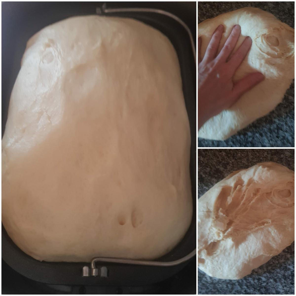 Primer levado Terminado el tercer amasado dejamos levar de 1 a 2 horas, en mi caso lo tuve una hora y casi se me sale del molde, en mi casa hace mucho calor… Sacamos la masa de la cubeta o bol, y la desgasificamos aplastando un poco la masa.