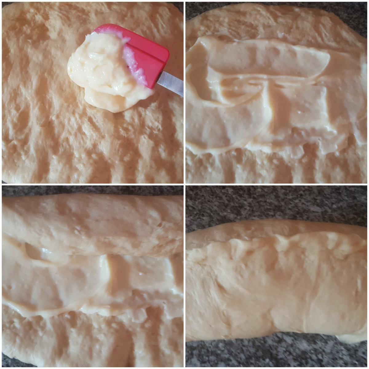 Preparar para el segundo levado Una vez desgasificada la masa, extendemos bien la masa con las manos, y le ponemos crema pastelera en el centro, la cantidad al gusto, extendemos bien y cerramos bien la masa para que no se salga la crema. .
