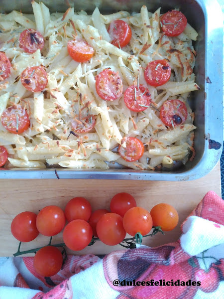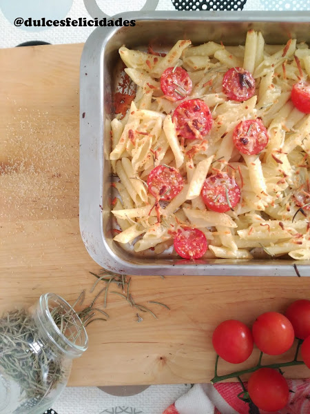 2. Colocamos los macarrones cocidos en una fuente para horno y disponemos encima los tomates cherry partidos por la mitad. Espolvoreamos con el ajo, el romero y el queso rallado.