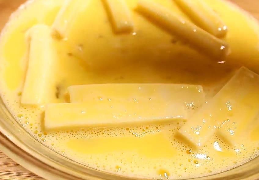 Sumerge cada palito de queso en la mezcla de huevo y agua, asegurándote de que esté completamente cubierto.