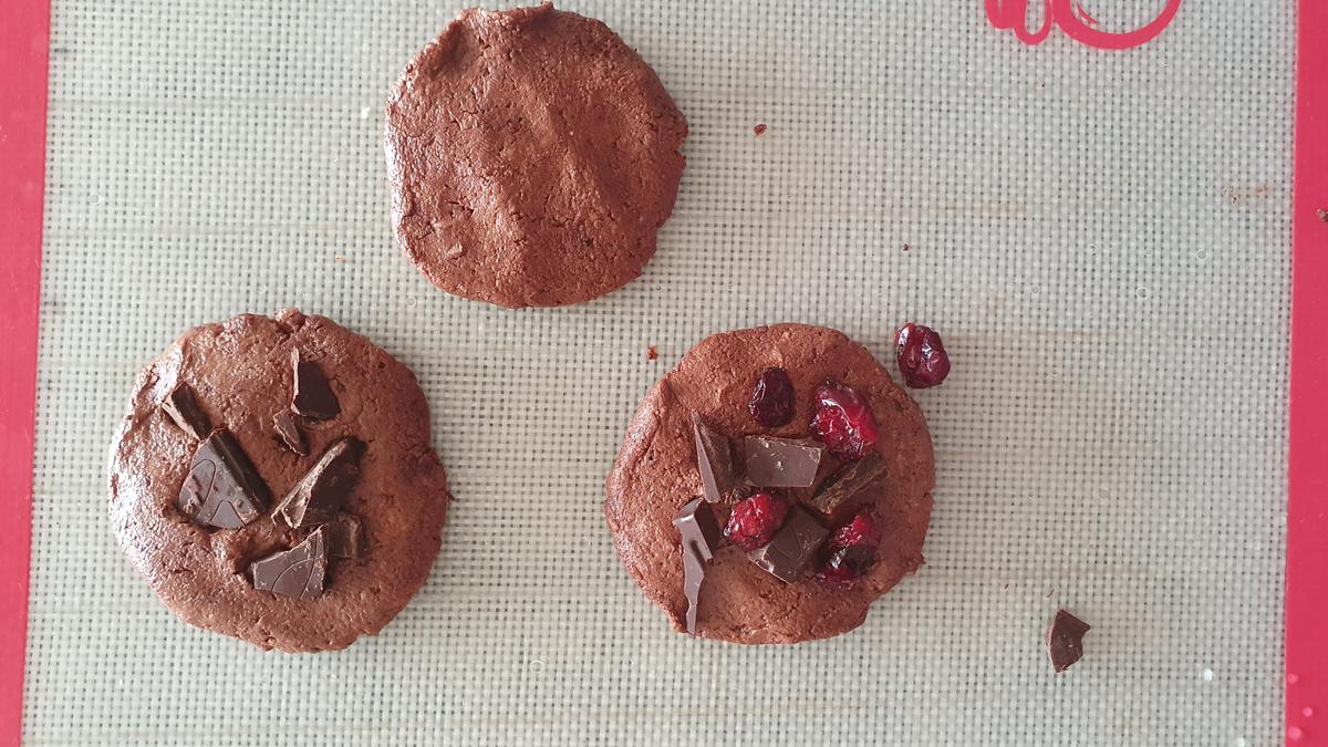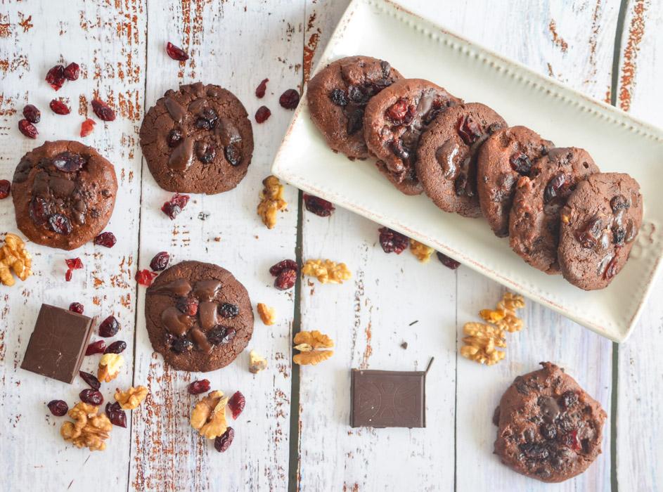 Una vez listas las galletas les recomiendo decorar con chocolate 80% y cranberries, logran una mezcla deliciosa y el toque perfecto para esta receta. Si no tienen pueden reemplazar con semillas de sésamo, coco rallado o lo que quieran.