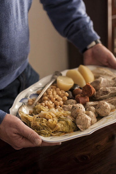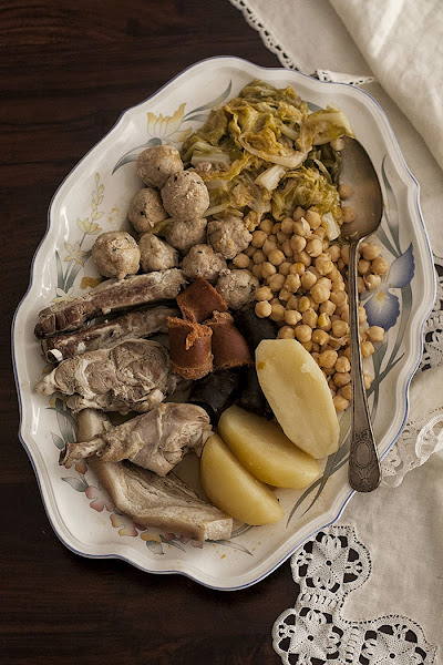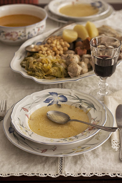A mis hijos, este plato les gusta muchísimo, sobre todo el intenso sabor que los ingredientes dejan en el caldo que ellos llaman "sopa especial". La cantidad de los ingredientes va "a ojo", pues así es como me la ha explicado mi madre, como casi todas las recetas que me explica, poned más o menos según lo que os gusten. Lo que hice para no equivocarme demasiado pues odio que queden muchas sobras, fue preguntar qué tipo de carne prefería cada comensal, y contar uno o dos trozos por persona. Si tenéis suerte aún podéis encontrar alguna col espléndida, a mí me gusta aprovechar hasta el último aire frío para hacerlo, pues este plato nos gusta aunque no esté caliente.