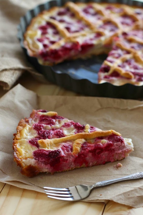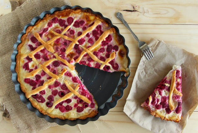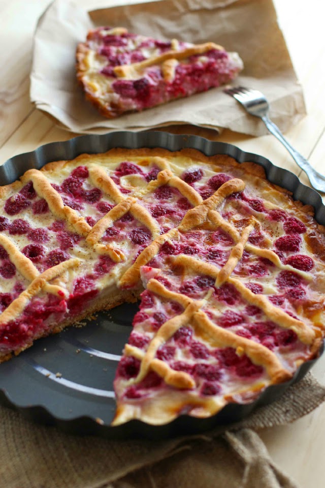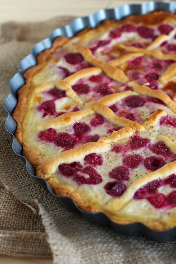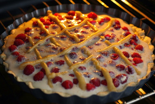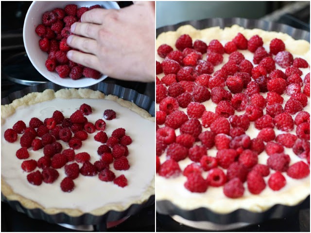 Escurrir la mitad de la mezcla sobre la masa prehorneada y luego agregar y distribuir las frambuesas sobre ésta. Finalmente agregar la otra mitad de la mezcla sobre las frambuesas y espolvorear con canela (aprox 1 cucharadita). Llevar al horno a 200°C durante aprox 35 minutos. El kuchen está listo cuando el relleno pasa a tener una consistencia más firme (asegurarse enterrando un cuchillo)